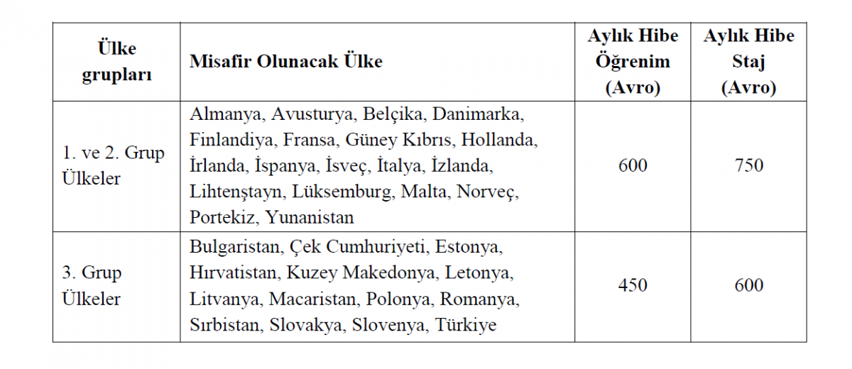 Ek 3: Ülkelere Göre Aylık Hibe Tablosu